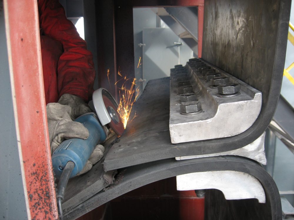 斗提升機(jī)輸送帶為條帶狀結(jié)構(gòu),裝配時(shí)需要采用夾具,將膠帶的兩個(gè)端部連接固定成為環(huán)狀,實(shí)現(xiàn)在滾筒帶動(dòng)下連續(xù)運(yùn)行。